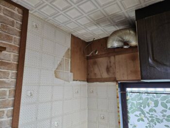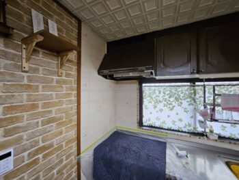 高所での作業になりますので、仮に道具を落としてしまったときにキッチンや床など傷がつかないように養生をして作業を行わさせていただいております!